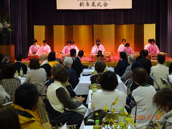 2026年1月25日(日)に文化協会・伝承芸能保存会による新年互例会が開催されました。先ずは「明日香の響き保存会」による八雲琴の初弾きが行われホールに響く琴の音色に聞き入りました。小学校3年生も参加して精一杯演奏する姿に大きな拍手が送られました。